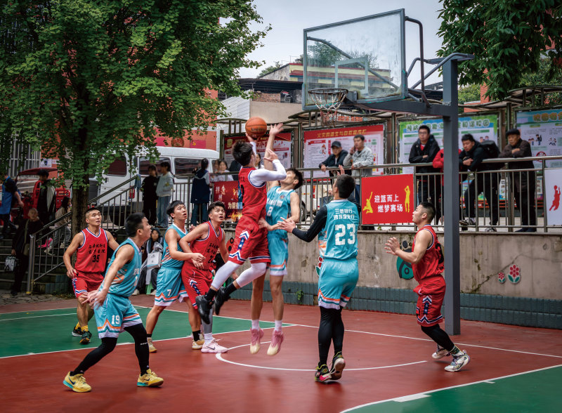 《迎“篮“而上》2025年10月25日,摄于重庆市沙坪坝区中梁镇的“渝超·家门口的赛事”蓝球赛场。