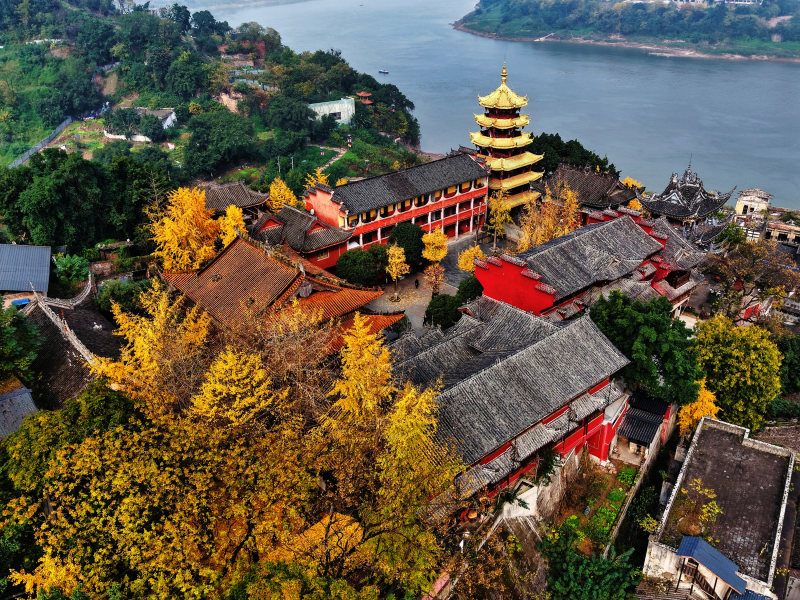 2025年12月11日,重庆市沙坪坝区,空中俯瞰磁器口宝轮寺。
