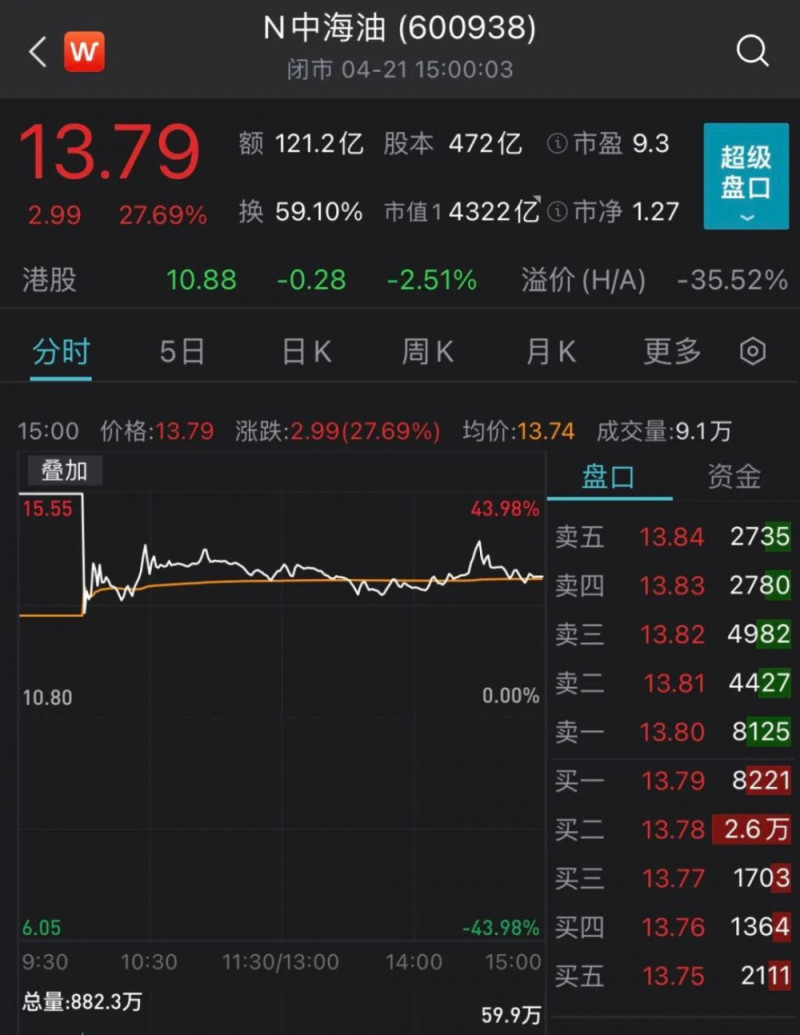 当天,中国海油开盘价12.96元,开盘涨幅20%,开盘后秒板涨停,股价15.55元,涨幅43.98%。截至收盘,中国海油股价13.79元,涨幅27.69%,总市值4306亿元。