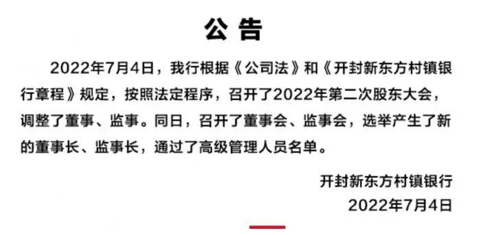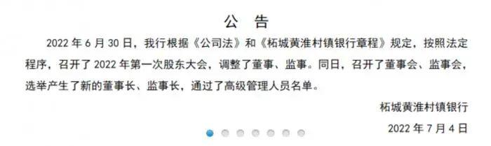 7月4日深夜,河南4家“取现难”村镇银行在官网先后发布公告称,6月30日/7月4日根据公司法和银行章程,召开了股东大会,调整了董事、监事。并于同日召开董事会、监事会选举产生了新的董事长、监事长,并通过了高级管理人员名单。