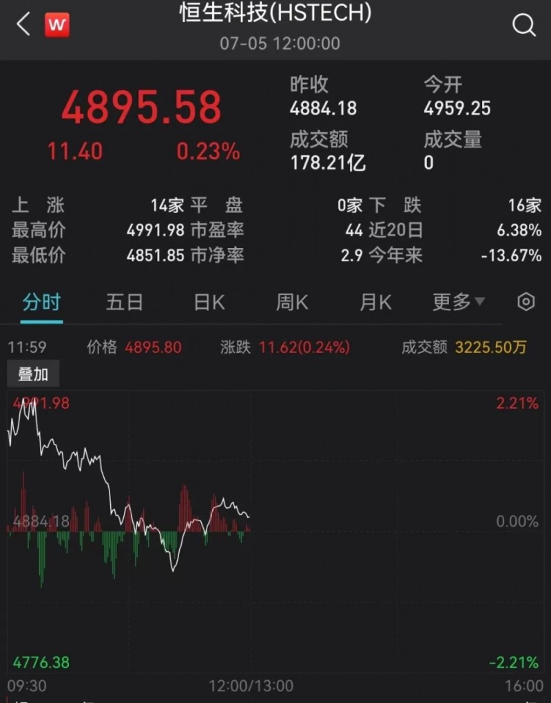 港股更是有惊无险。恒生科技指数由涨超2%,一度翻绿,临近午间收盘,再度翻红。