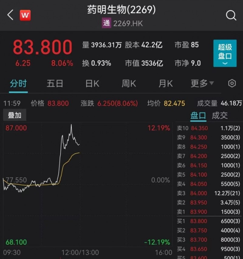 个股上,药明生物直线拉升大涨超12%,截至发稿上涨超8%,总市值3536亿港元(约合人民币3017亿元)。