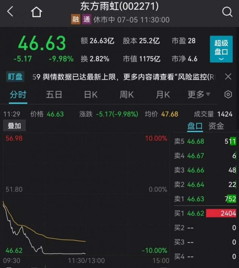 7月5日,东方雨虹跳水闪崩,截止发稿,报46.62元,跌9.98%。