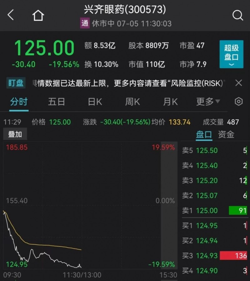 5日早盘,靠着一款“近视神药”撑起的40倍牛股兴齐眼药股价又崩了,截至午间收盘,下跌19.56%,逼近跌停。