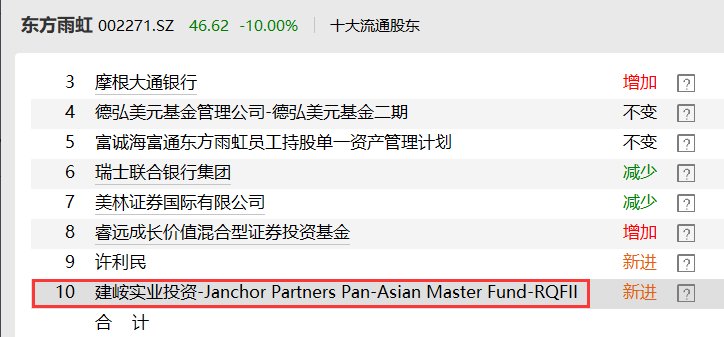 一季报显示,除了一直看好东方雨虹的睿远再次增持之外,一只RQFII基金也进入前十大流通股东。