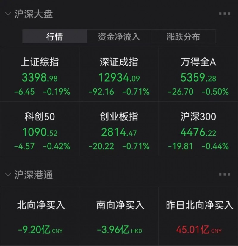 截至收盘,沪指跌0.19%,深成指跌0.71%,创业板指跌0.71%。北向资金方面,沪股通早盘净流入1.44亿,深股通早盘净流出9.16亿,早间11点前,深股通一度流出超15亿。