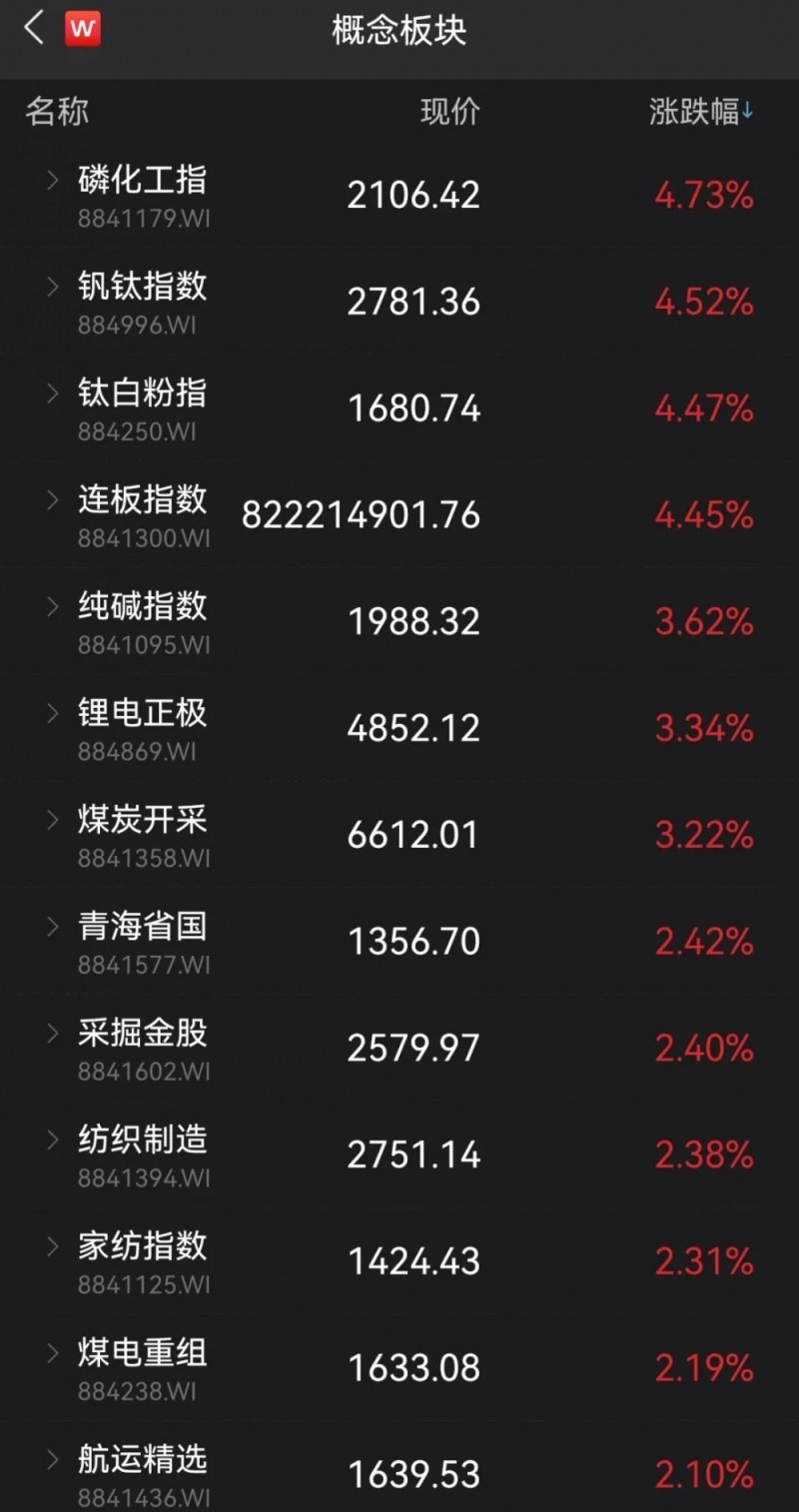 A股板块方面,中报业绩预期向好的周期类板块再度活跃,煤炭、磷化工、化肥等板块领涨。钒电池板块持续大涨,攀钢钒钛3连板。电力股再度活跃,赣能股份6连板。