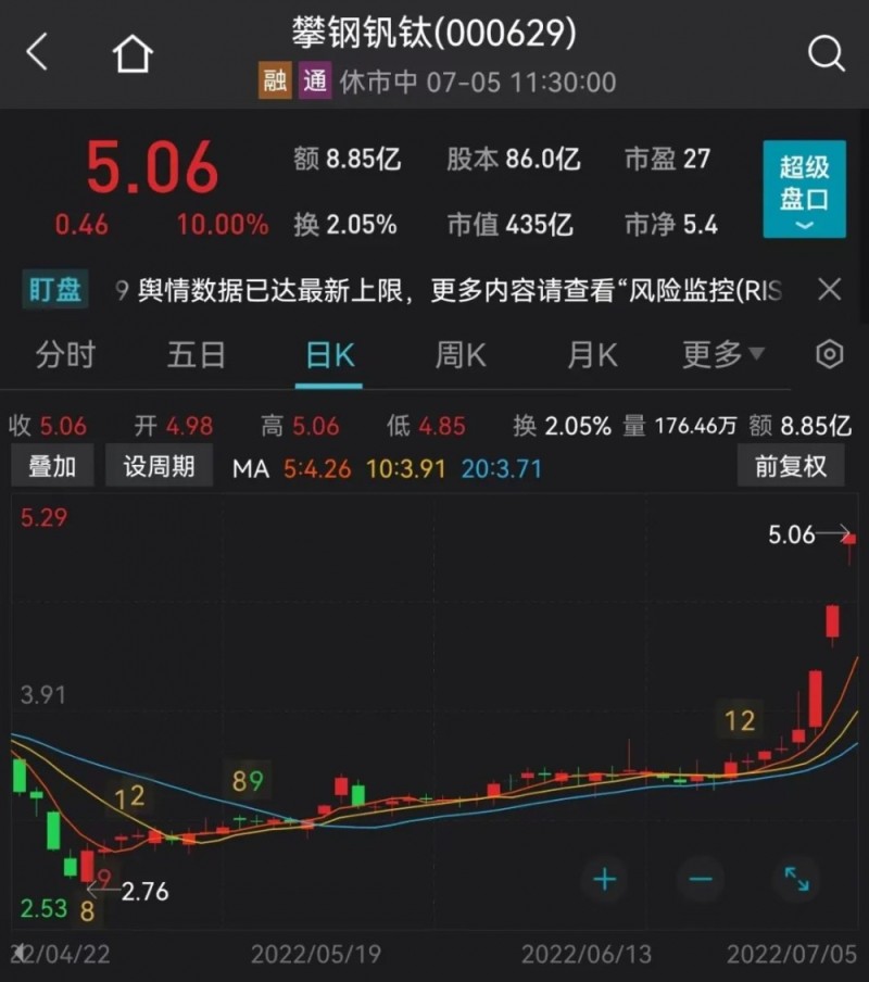 钒电池板块持续大涨,攀钢钒钛3连板。