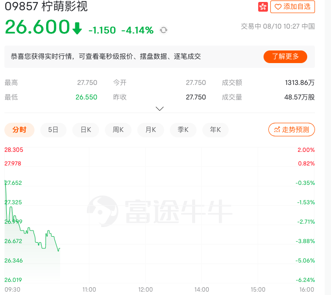 作为拉开影视行业今夏IPO序幕的首位选手,柠萌影视不但公开发售认购额不足,且在3家券商的暗盘都出现破发。当中,富途暗盘跌3.24%,报26.85港元,每手账面亏损90港元,成交额185万;辉立暗盘跌2.52%,成交额285万;耀才暗盘微跌0.18%。