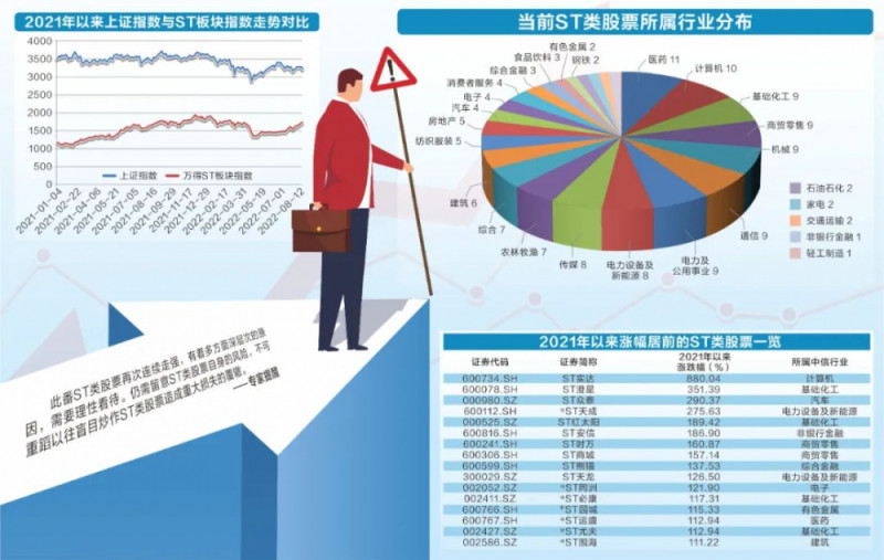 行情数据显示,自2021年一季度开始,ST类股票总体持续上涨,万得(Wind)编制的ST板块指数涨至2021年年底的近2000点,近乎翻倍,其后一度有所回调,至今年5月份跌至1300多点。不过,从今年5月份开始,指数开启新一轮升势,目前重新涨至超过1700点。