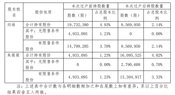 而在两人离婚后,刘迪将其名下持有的约1116万股股票分割给朱筱筱。截至公告披露日(即9月22日),相关股份涉及的过户手续已经完成。