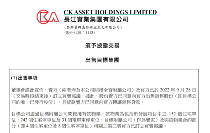 长实集团在港交所公告中表示,公司间接全资附属公司Mesa Investment和CK Property & Asset Holdings(卖方)及ORIC-Borrett(买方)已于9月28日订立买卖协议。根据协议,卖方将以207.66亿港元出售香港物业项目。该物业包括发展项目(即半山波老道21号超级豪宅项目)中的152个住宅单位、242个住宅停车位及31个电单车停车位。