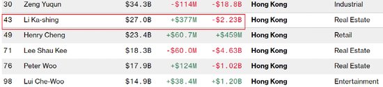 随着股价及资产走跌,李嘉诚的身家也受到影响。据彭博亿万富豪指数,李嘉诚年内资产缩水22.3亿美元(约161亿元人民币),以270亿美元(约2000亿人民币)在香港地区排名列第二。同时,香港不少地产系富豪身家也出现缩水。