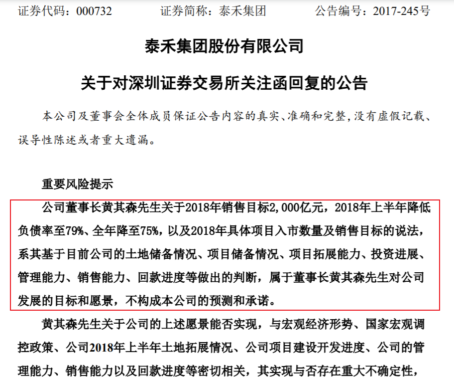 2017年12月,黄其森在接受媒体采访时喊出了“2000亿元”的销售目标,一度引发深交所发出关注函,以至于后续泰禾方面在回复关注函时解释这“属于董事长黄其森对公司发展的目标和愿景,不构成本公司的预测和承诺”。