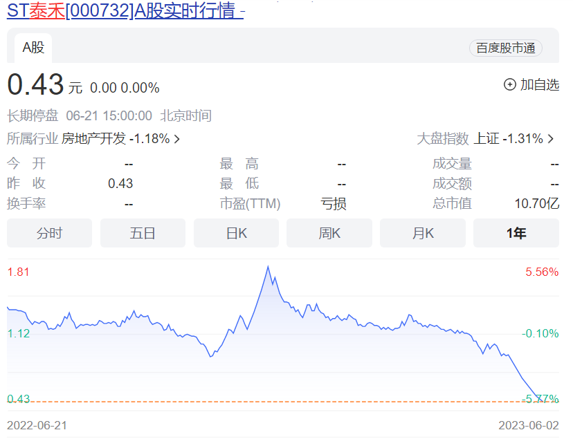 泰禾股价最终定格在0.43元 图片来源:百度股市通