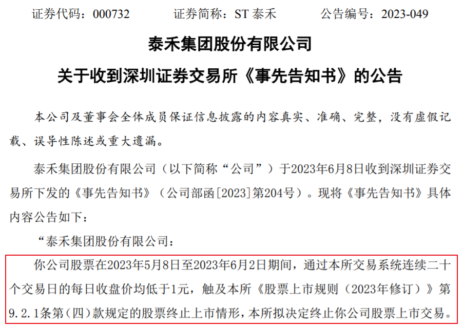 6月8日晚,深交所向泰禾下发《事先告知书》,“拟决定终止你公司股票上市交易”。
