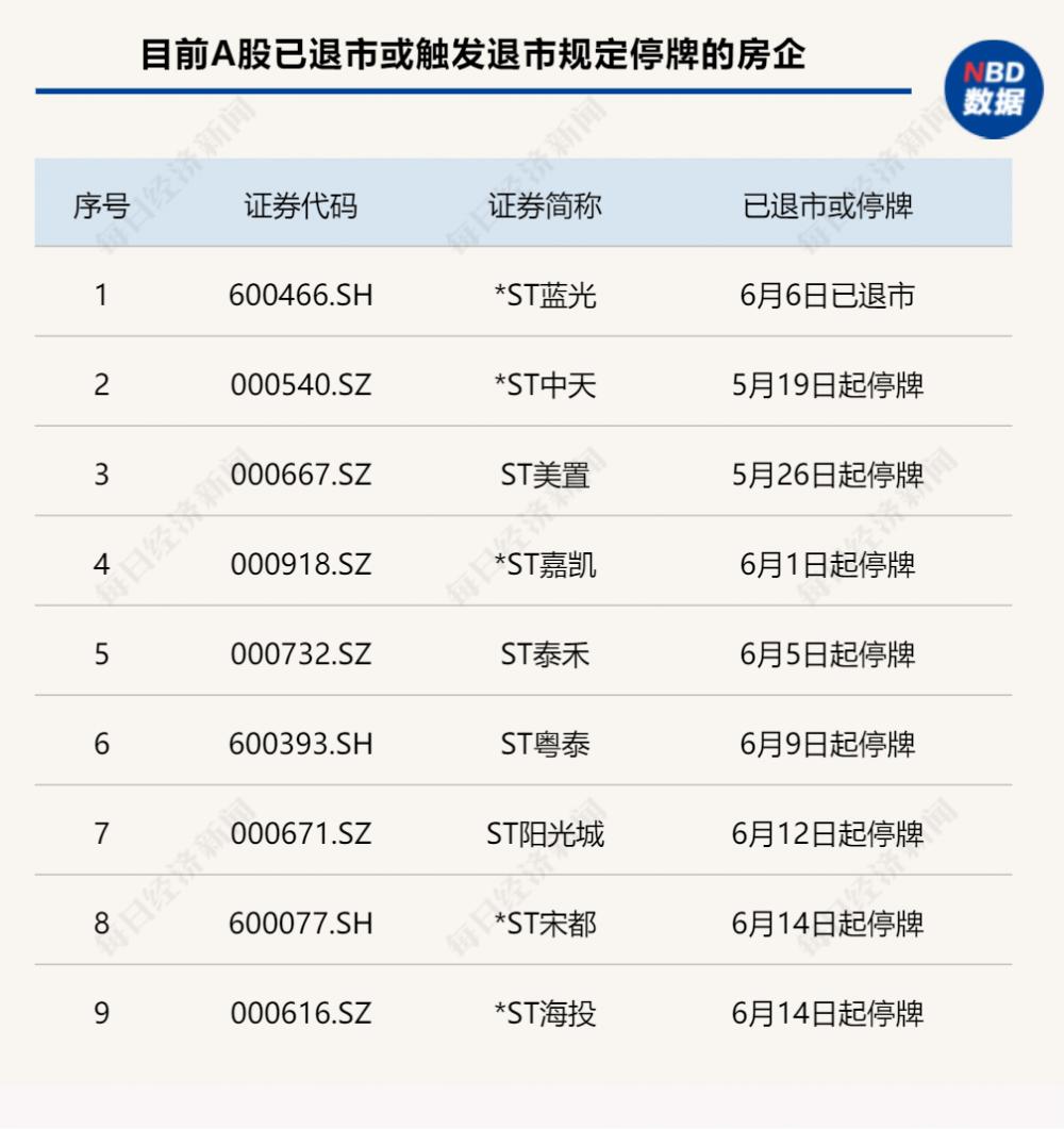 此外,*ST宋都、ST粤泰、*ST海投、ST美置、ST泰禾、ST阳光城、*ST嘉凯均已触发终止上市条件而停牌。在停牌后的15个交易日内,根据上市委员会的审核意见,交易所将作出是否终止上述7家房企上市的决定。