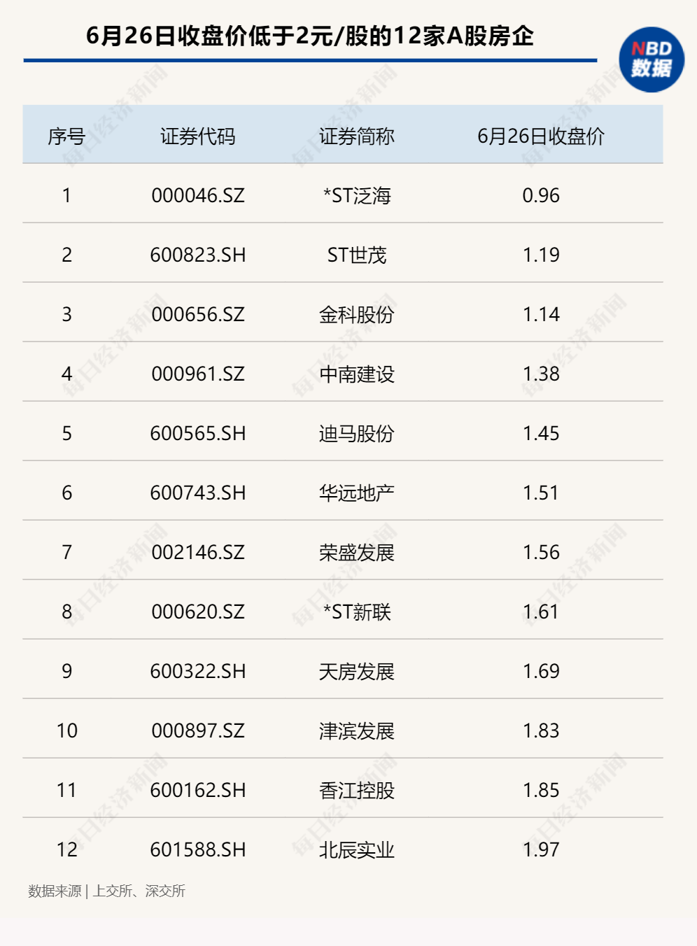 截至6月26日收盘,A股共有12家房企的股价低于2元/股,其中泛海控股已经连续12个交易日低于1元/股,可能触发终止上市条件。而其余股价高于1元的企业中,也有部分企业的股价此前曾经跌至1元左右,随时可能面临退市风险。