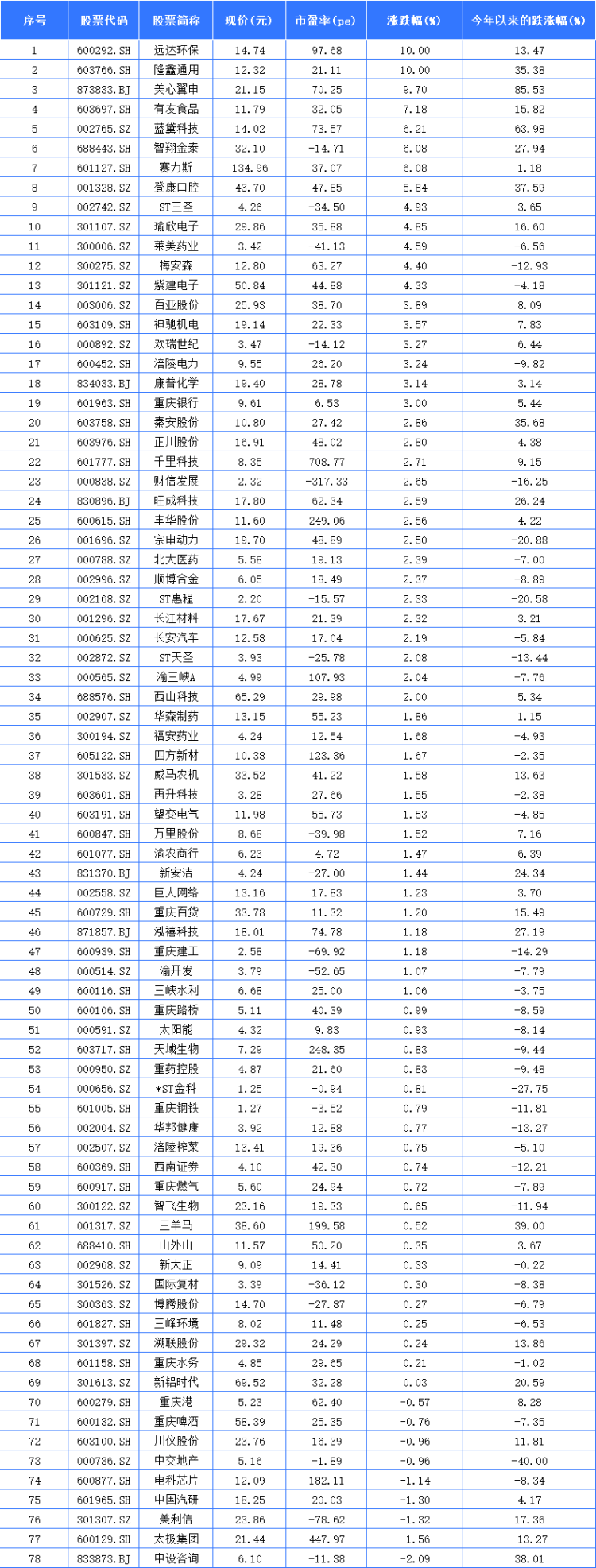 4月14日,78家重庆A股上市公司中有69家上涨。