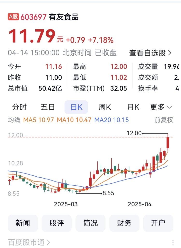 有友食品报收11.79元,日涨幅7.18%,换手率4.67%,今年以来的涨幅为15.82%。