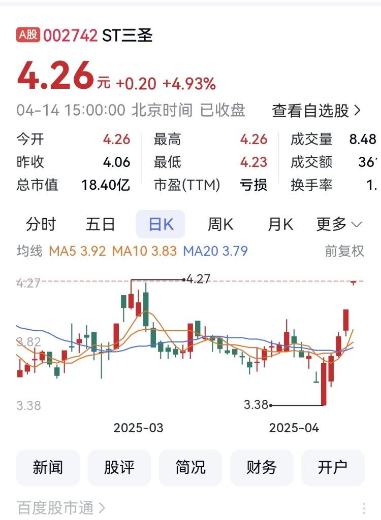 4月11日,ST三圣报收4.26元,日涨幅4.93%,列渝股日涨幅第九,二连板,换手率1.96%,今年以来的涨幅为3.65%。