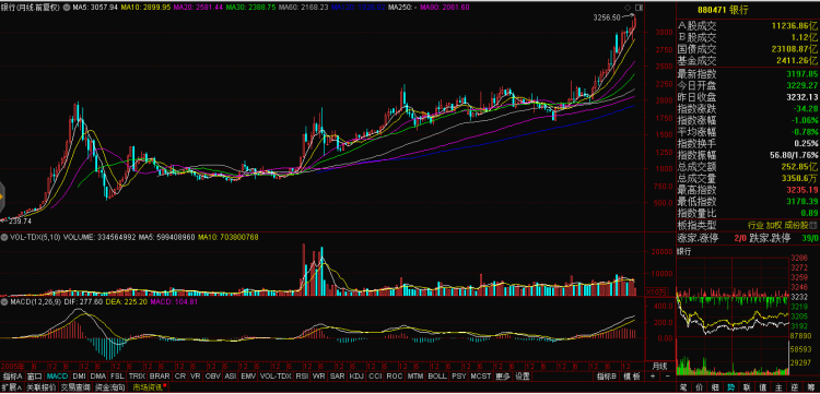 无独有偶,当天A股银行板块也突然降温。通达信数据显示:当日银行指数低开0.09%后快速跳水,仅用时1小时跌幅就达到了1.66%。其后,多方反攻,但力度不强。终盘,银行指数下跌1.06%,结束了连续7天的强劲升势。