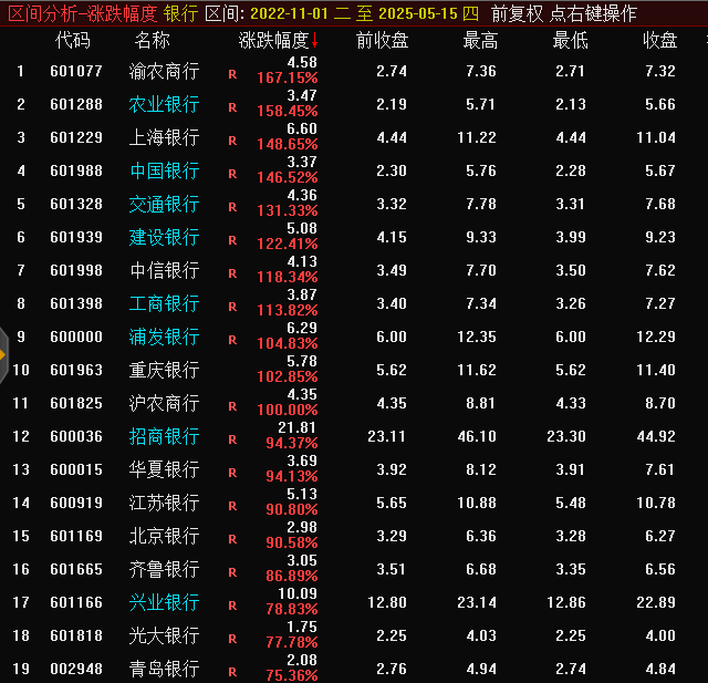 自2022年11月1日见底以来,银行指数从最低1693.78点涨到本周最高3256.50点,区间2.5年涨幅92.26%,位列主要行业与板块第1名。42家银行股在此期间除兰州银行与郑州银行下跌外,其余不同程度上涨。其中,渝农商行以167.15%的涨幅位居榜首,农业银行以158.45%的涨幅紧随其后,上海银行以148.65%的涨幅名列第3,中国银行、交通银行、建设银行、中信银行、工商银行、浦发银行、重庆银行、沪农商行涨幅均超100%。并且,期间更有10只银行股股价突破过历史新高。