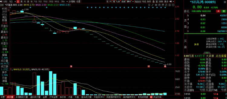 而在监管重罚、退市预期与经营困境叠加下,市场对*ST高鸿已几乎丧失信心。过去近一个月,公司股价毫无反弹迹象,连续跌停意味着流动性完全枯竭,投资者基本无从减仓。