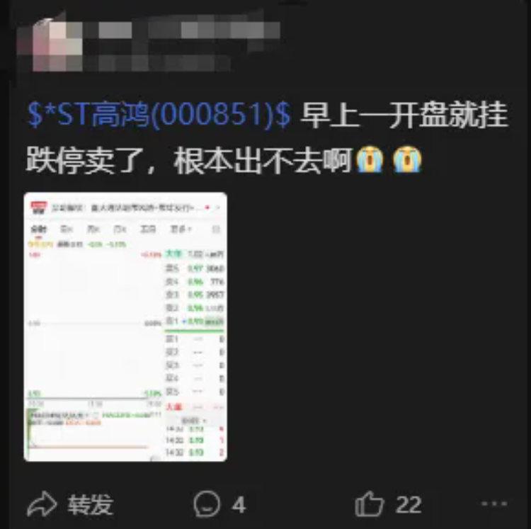 而自8月11日起,*ST高鸿已经连续20个交易日跌停。在A股市场的ST板块中,这一走势极为罕见。对于不少中小投资者而言,股价的连续跌停意味着几乎没有退出的流动性,只能眼睁睁看着市值不断缩水。