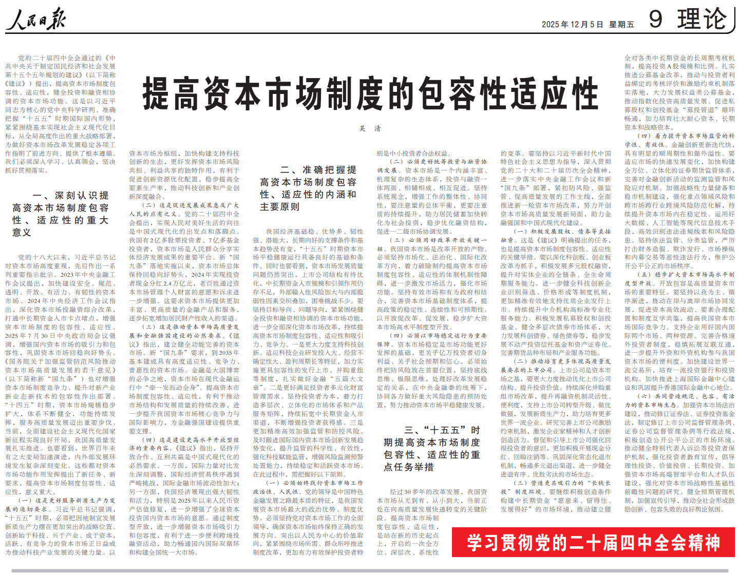 12月5日,《人民日报》刊发中国证监会主席吴清的署名文章,题为《提高资本市场制度的包容性适应性(学习贯彻党的二十届四中全会精神)》。全文如下: