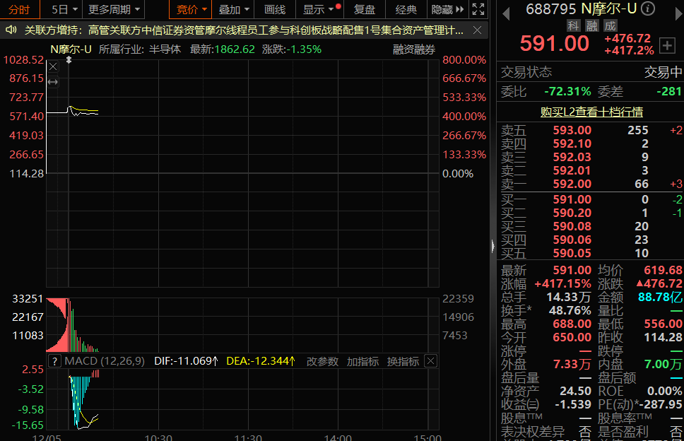 不过,随后摩尔线程股价有所回落,截至记者发稿时,摩尔线程报591.00元/股,涨417.2%。