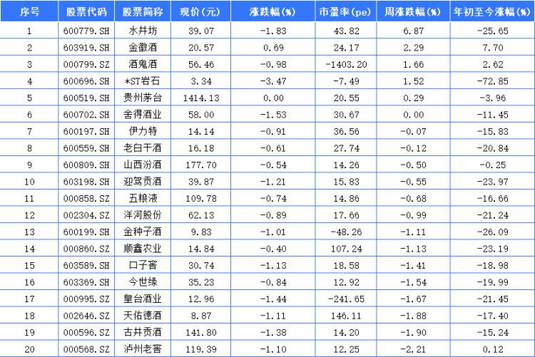 泸州老窖以-2.21%居白酒A股周涨幅末位