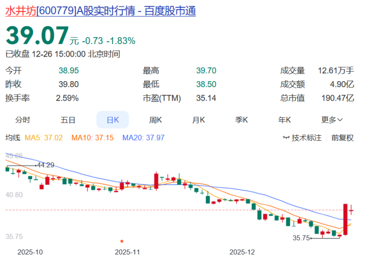 12月26日,水井坊报收39.07元,涨-1.83%,以6.87%列白酒A股周涨幅第一,今年以来涨幅为-25.65%。