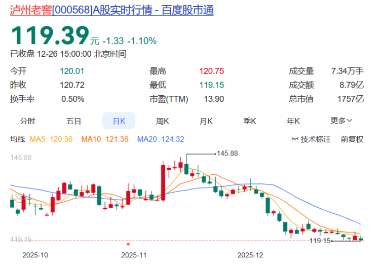 12月26日,泸州老窖报收119.39元,跌1.10%,周涨幅累计-2.21,居白酒A股周涨幅末位,今年以来涨幅累计0.12%。