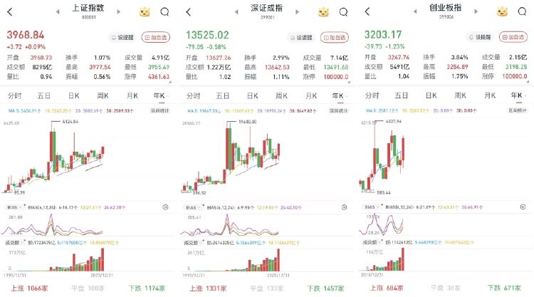 至收盘,上证综指涨0.09%,报3968.84点;科创50指数跌1.15%,报1344.2点;深证成指跌0.58%,报13525.02点;创业板指跌1.23%,报3203.17点。